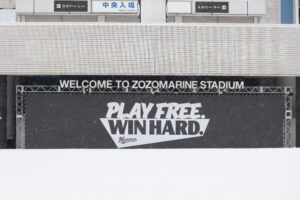 ※編集後記・・・2/8は深夜から降雪に、もしかしたらZOZOマリンスタジアムも真っ白か!これは吉兆! 早朝、慣れない手つきで愛車にチェーンを巻き、鎌ヶ谷市内を出発。1時間30分かけて幕張新都心へ到着! 下記写真は、目まぐるしく変わる天気を写し撮ったものです。今年も逆境に負けず応援しましょう!