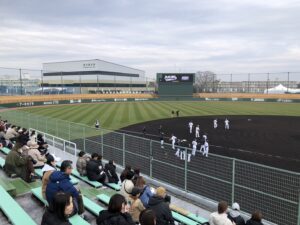 都城コアラのマーチスタジアム/左奥の建物は屋内練習場/中央のスコアボード右側にサブグランドやブルペンと続く/晴天あれば高千穂峰の素晴らしい眺望が楽しめる。