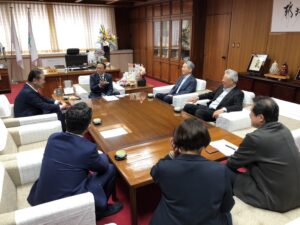 都城市長を表敬訪問(都城市役所市長室)画面奥中央が都城市池田市長、右:花島代表、林副代表、左:長谷川事務局長 手前:市幹部等