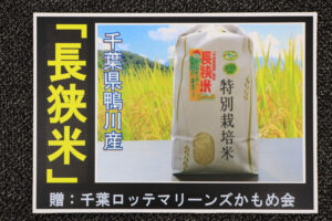 贈呈の「長狭米」ボード(他:目録一式)