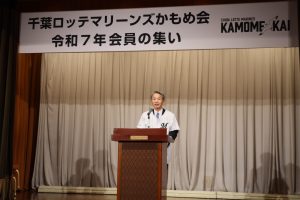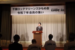 令和7年11月28日(金)「千葉ロッテマリーンズかもめ会」の今シーズンの支援事業の締めくくりとして「会員の集い」を開催しました。「集い」には、高坂球団社長、サブロー監督、山本選手、木村選手、寺地選手も招き、花島代表から激励と労いの言葉を伝えました。かもめ会では「集い」に先立って、役員会、会員総会を開催し来季の支援活動など決定しました。場所:ホテル ザ・マンハッタン