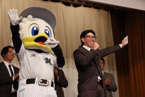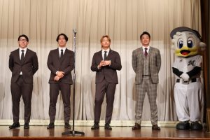 ステージ登壇 右からマーくん、サブロー監督、山本大斗外野手、木村優人投手、寺地隆成捕手